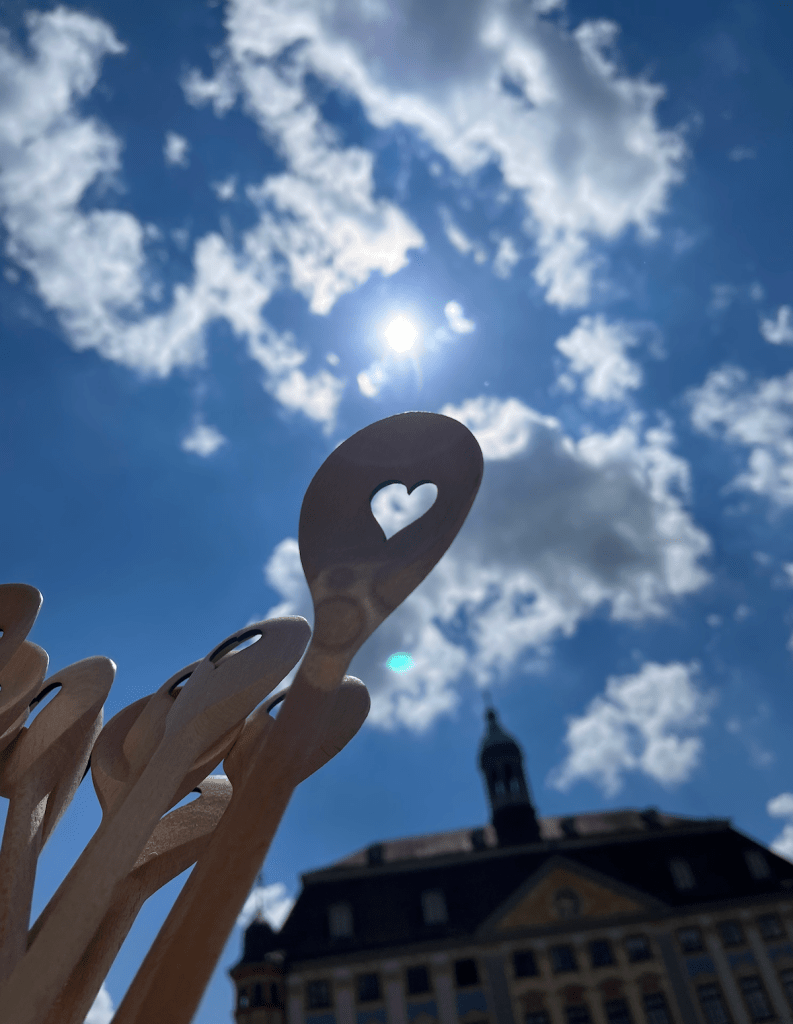 Auf dem Coburger Wochenmarkt bot jemand geschnitzte Kochlöffel feil. Die Löffel haben ein Herz eingearbeitet bekommen. Das führt beim Rühren dazu, dass die Suppe durch das Herzloch strömt – strömen muss. Das Herz ist zwar physisch nicht in der Suppe vorhanden, aber die gesamte Suppe ist durch die anwesende Abwesenheit des Herzförmigen vom Herzen berührt – weil gerührt.